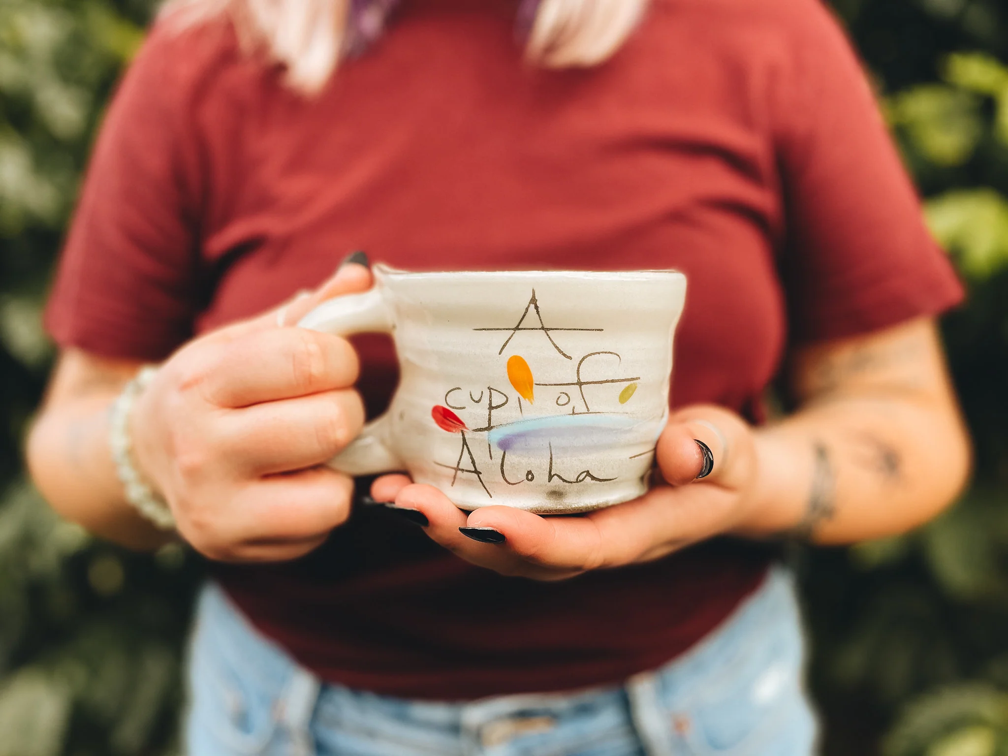 Exclusive for Green World Coffee Farm. These custom handmade mugs hold the perfect cup of aloha. Coming in three different accent colors, and hidden hearts and internal infinity swirls have us swooning!