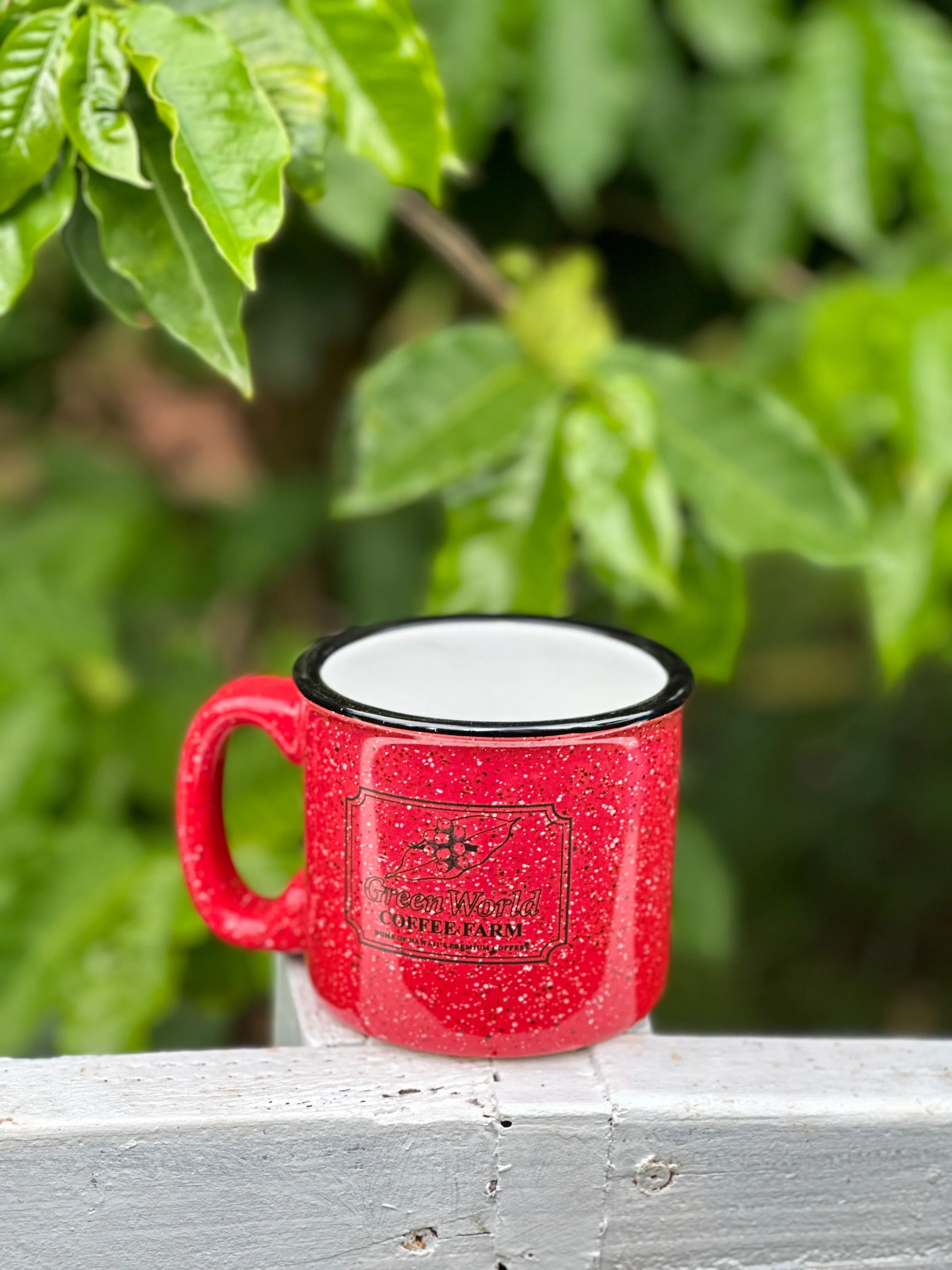 If you are looking to add a rustic but vibrant touch to your mug collection our 15 oz. campfire mugs are perfect! This style is available in aqua, coral, blue, red or white, all with black speckles. This mug is a double sided logo mug with our Caffeine Molecule logo on one side and our Green World logo on the other!